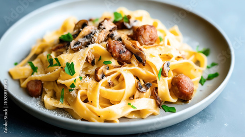 Plate of fettuccine pasta with mushrooms, sausage, and grated cheese garnished with fresh parsley.