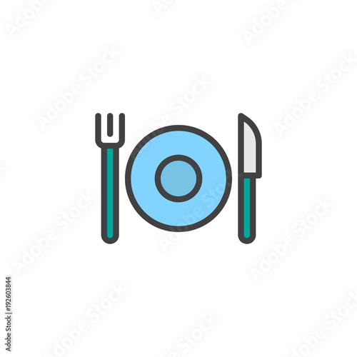 Plate with cutlery filled outline icon, line vector sign, linear colorful pictogram isolated on white. Fork and knife with plate symbol, logo illustration. Pixel perfect vector graphics