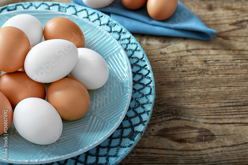 Plate with raw eggs on wooden background