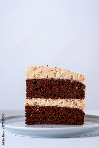 Plate with slice of tasty homemade chocolate cake on a white table