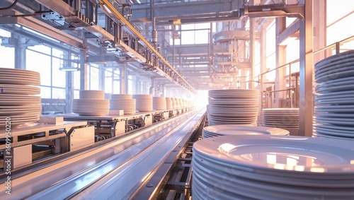 Plates move along a conveyor belt in a factory, highlighting mass production and efficiency.