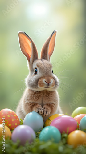 Playful Easter Bunny Surrounded by Vibrant Colorful Eggs, Spreading Joy and Celebrating the Spirit of Easter Festivities.