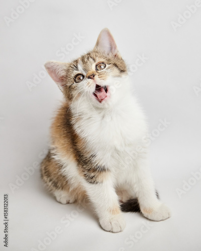 Playful kitten with a mix of fur colors, sitting on a light background, expressing curiosity and joy, showcasing its playful nature and adorable features