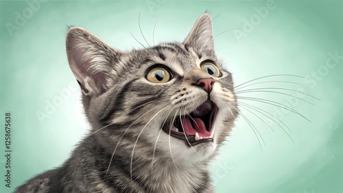 Playful Kitten with Big Expressive Eyes, Joyfully Meowing Against a Soft Aqua Background