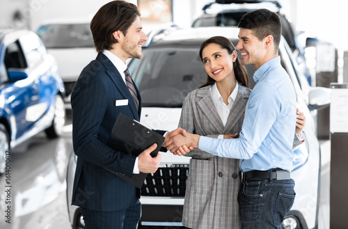 Pleasure Working With You. Beautiful couple embracing after buying new car, shaking hands with salesman