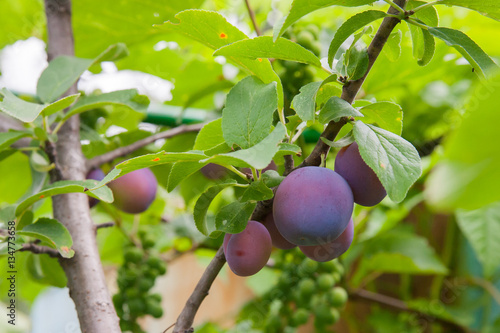 Plum tree with delicious big red plums at sunrise