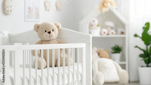 Plush Teddy Bear in Pristine White Nursery for Tranquil Baby Space and Care : Generative AI