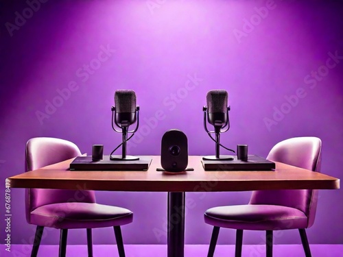 Podcast table with two chairs and a microphone