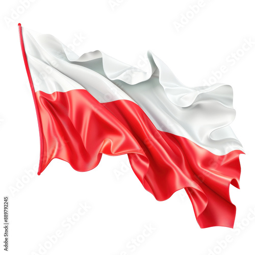 Polish flag waving in the wind isolated on a white background. Red and white national symbol of Poland.