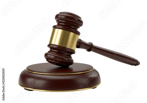 polished wooden gavel resting on a round base with metallic gold accents, symbolizing justice and authority, isolated on white background
