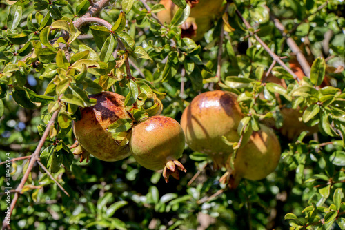 Pomegranate fruit on the tree in the garden on the summer afternoon