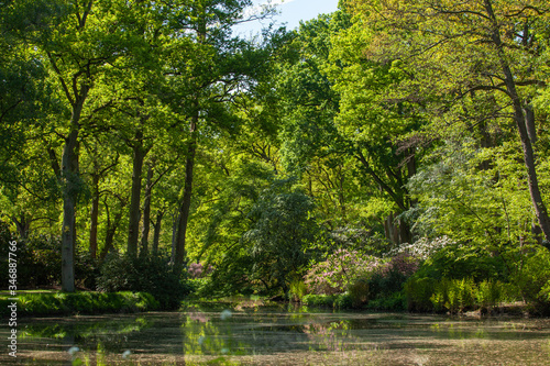 Pond, trees and green grass in a public park.