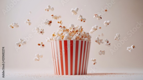 Popcorn Flying Out of Classic Red and White Bucket Against Neutral Background