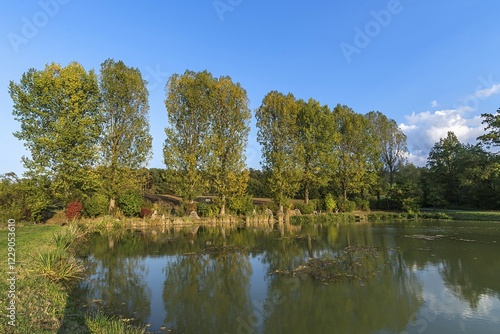 Poplars (Populus) at the carp pond in the evening light, Franconia, Bavaria, Germany, Europe