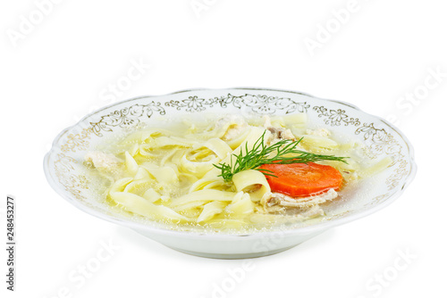 Porcelain plate with noodles soup isolated on white background