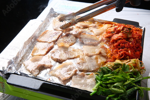 Pork belly that is cooked on a Korean-style grill