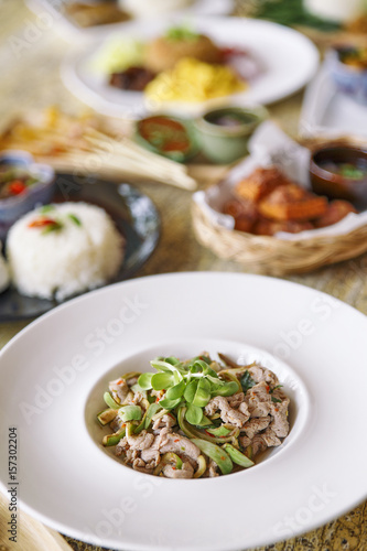 Pork with Herbs and Egg Plant Spicy Salad on table