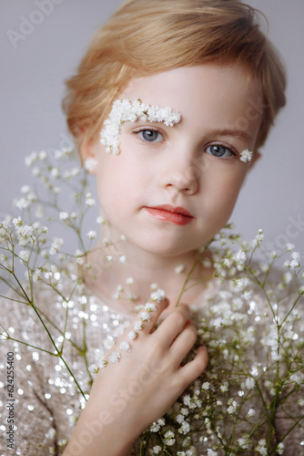 Portrait of a beautiful blondie child girl with perfect skin and creative floral makeup look. Gypsophila eye makeup. The concept springtime, congratulations on women's day or mothers day.