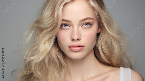 Portrait of a beautiful, elegant, sexy Caucasian woman with perfect skin and white long hair, on a gray background.