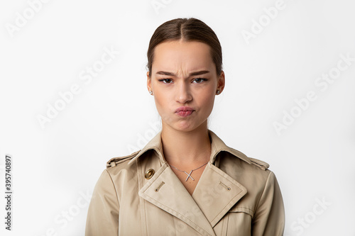 portrait of a beautiful girl with emotions of discontent and dislike. Displeased Facial Expression. Close-up photo in studio