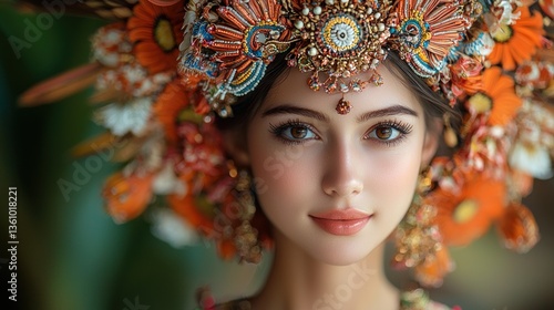 Portrait of a beautiful woman wearing an ornate headdress and jewelry.