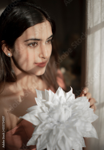 Portrait of a beautiful young woman, standing near the window in sunshine/sunlight with a flower in her hand.
