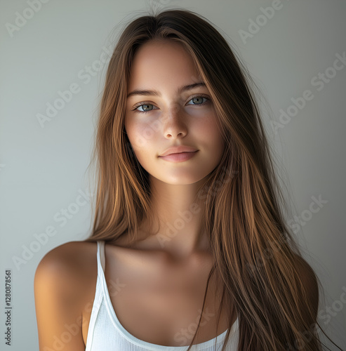 Portrait of a beautiful young woman with clean, fresh skin on a white background.