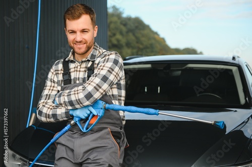 Portrait of a car wash station worker holding a water jet gun next to a clean car