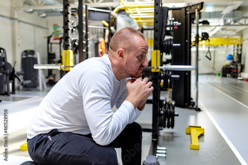 Portrait of a Caucasian adult man sitting on the bench at the fitness center and relaxing. One man, young male fitness instructor alone in gym. Man resting after exercising on exercise-machine in gym.