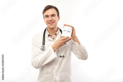Portrait of a doctor in white medical coat demonstrating a jar of collagen isolated on white background with copy space