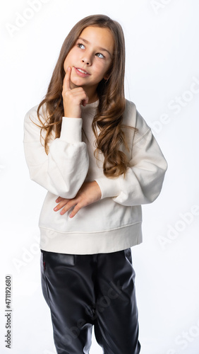portrait of a girl in the studio. beautiful little girl in a white sweatshirt and trousers is smiling. isolated white background