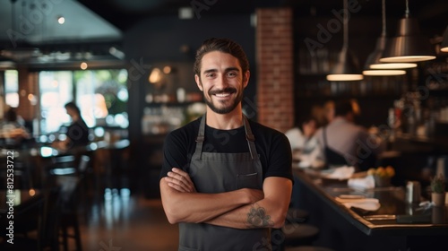 Portrait of a handsome barista in black t-shirt and apron standing at the bar of the modern cafe