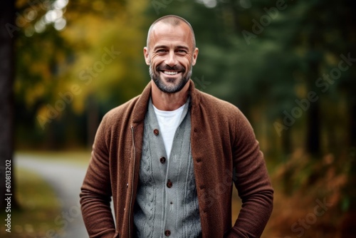 Portrait of a handsome mature man in the autumn park. Men's beauty, fashion.