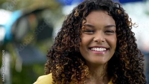 Portrait of a happy black millennial girl standing outdoors smiling. A Brazilian hispanic African American young woman with curly hair