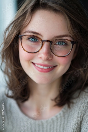 Portrait of a happy woman wearing glasses and smiling at the camera, suitable for use in articles, blogs or social media profiles