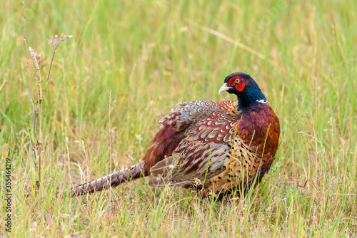 Portrait of a male common pheasant (phasianus colchicus) standing in a meadow