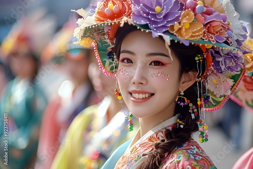 Portrait of a North Korean Woman in Traditional Attire Celebrating a Festival Outdoors. Capturing the Beauty and Pride of North Korean Culture During a Joyous Occasion. A Reflection of Ethnic Heritage