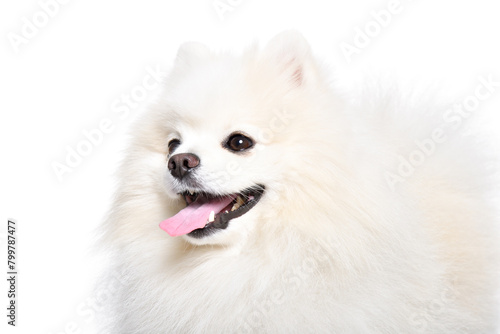 Portrait of a Pomeranian Spitz, side view, isolated on a white background