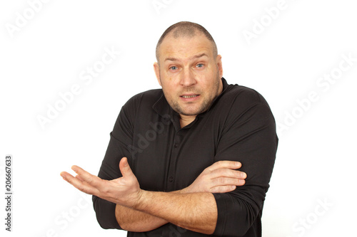 Portrait of a powerful middle-aged man on a white background showing a puzzled gesture assigned to the side arm and the expression of helplessness in this situation