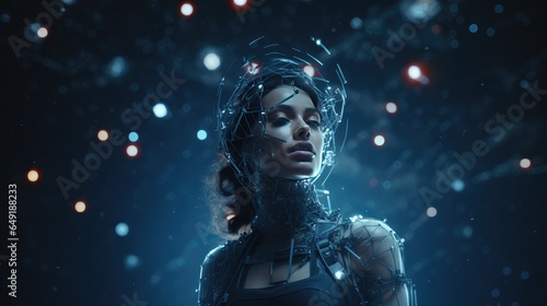 Portrait of a robot girl in a futuristic style. Earth sphere around the girl. Project map of the earth and fragments