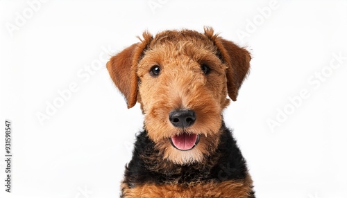 笑顔のエアデール・テリアの子犬のポートレート(Portrait of a smiling Airedale Terrier puppy on white background)