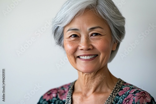 Portrait of a smiling elderly Japanese woman with grey hair isolated on white background
