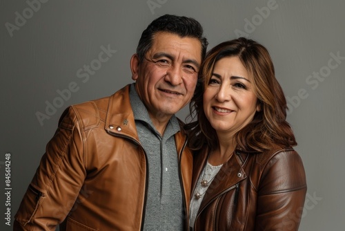 Portrait of a smiling latino couple in their 30s sporting a stylish leather blazer over soft gray background