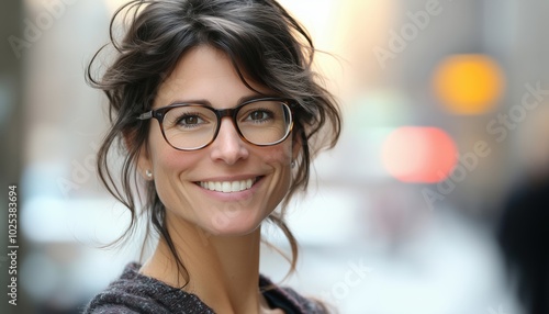 Portrait Of A Smiling Woman In Closeup With Glasses: A Successful Entrepreneur Relaxing In New York City During A Break