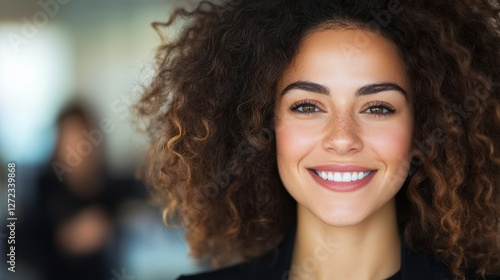 Portrait of a smiling young woman with curly brown hair. She's wearing a dark top, and the background is blurred.