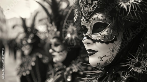 portrait of a woman at the Venetian carnival wearing a mask decorated with feathers, costumed performance, traditional street festival, circus and theater artist, black and white photo