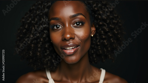 Portrait of a woman with curly hair, glowing skin, and a radiant smile. Elegant and confident expression with natural beauty, soft lighting, and detailed features against a dark background.