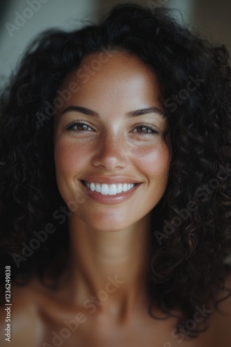 Portrait of a woman with dark skin and curly hair smiling at the camera.