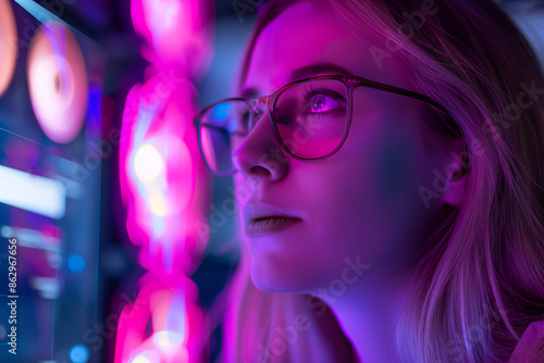 Portrait of a woman with glasses in front of colorful lighting