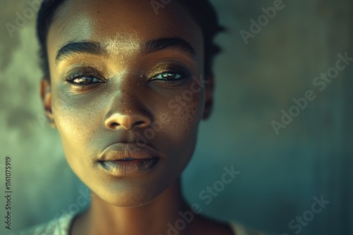 Portrait of a woman with makeup and glitter on face, looking contemplative.
